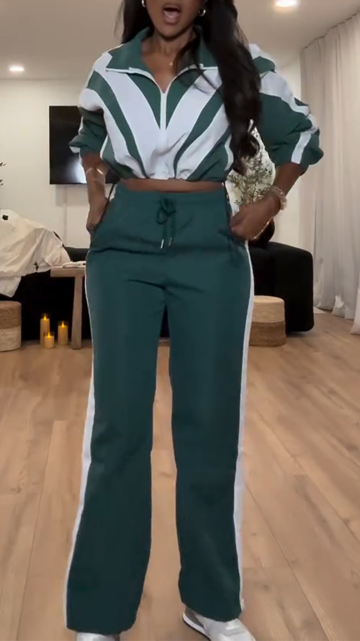 Ladies' Round Neck Patchwork Striped Casual Suit