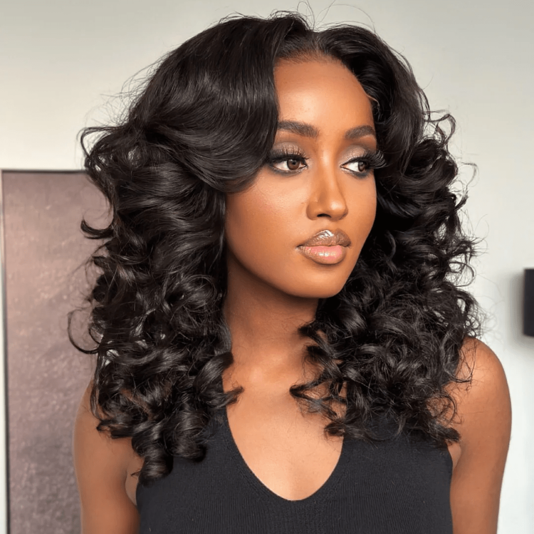 Geeta Pre-Cut Lace Put On And Go Glueless Wig 13x4 Loose Body Wave Lace Front Wigs with Curtain Bangs 180% Density