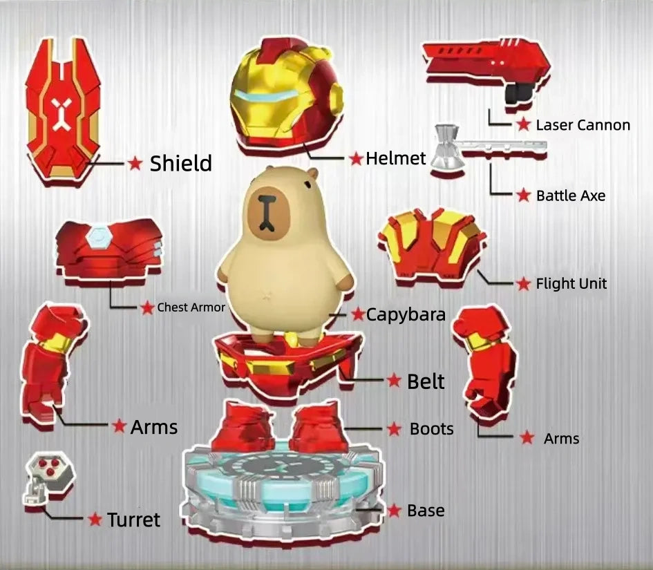 The set includes magnetic armor pieces that snap together effortlessly, allowing you to customize your Capybara Iron Man's look and pose. Perfect for display on your desk, shelf, or as a playful addition to any collection. Whether you're a fan of comics, capybaras, or cool collectibles, this whimsical mashup is sure to spark joy and conversation!
