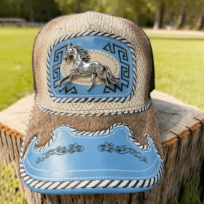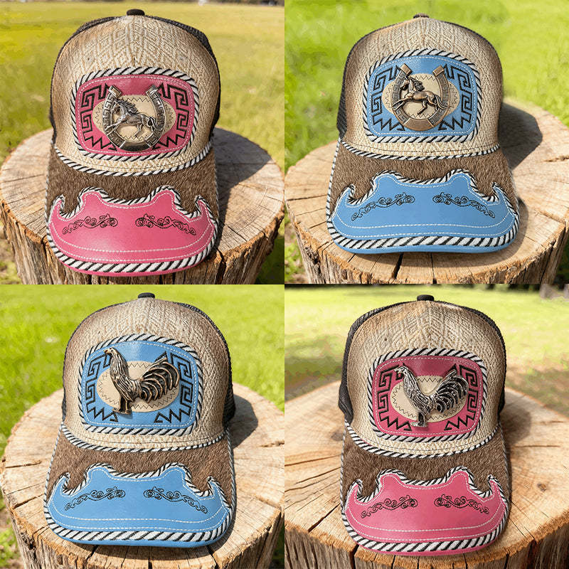 【UNIQUE & CLASSIC WESTERN】 Women's woven patchwork western hat, featuring long horn accents inlaid on intricately carved faux leather panels, instantly infusing your look with cowboy flair. The faux horsehair trim along the brim adds a touch of authentic western charm.