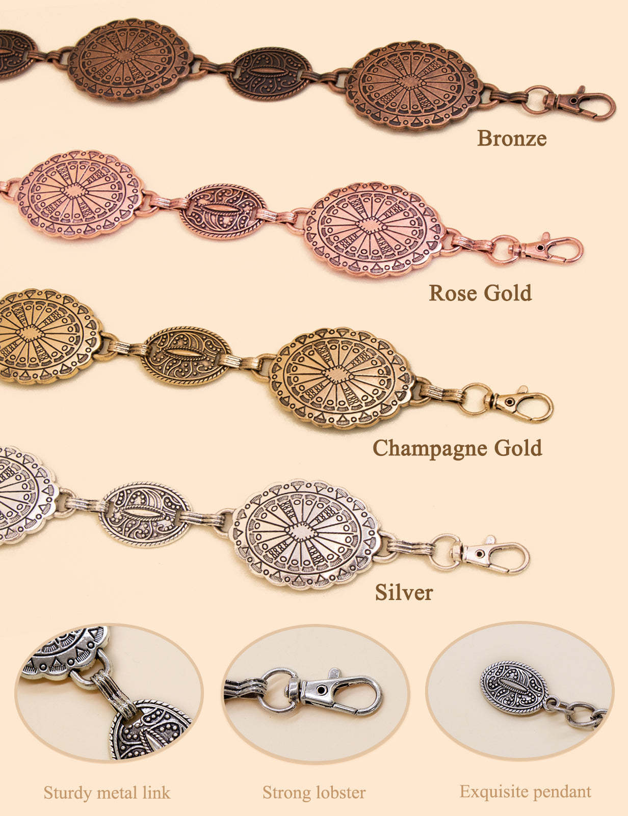 【STURDY AND DURABLE】 Cowboy belts for women. This western belt is crafted from premium zinc alloy and finished with a 4-step electroplating process: copper plating → color plating → antiquing finish → oil sealing for color protection. Boasting far superior color retention compared to standard plating processes under normal use, it perfectly balances substantial metal weight with comfortable wear for a premium look and feel.