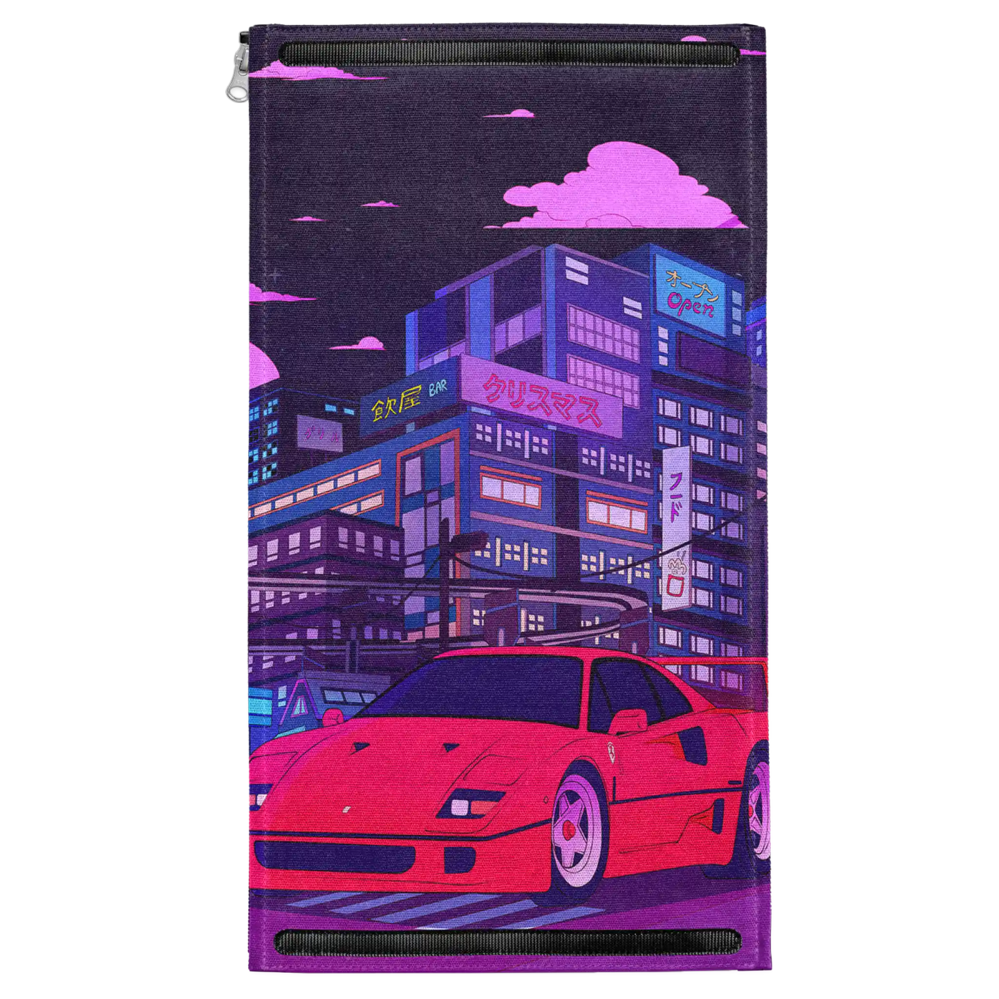 A neon red sports car cruises through a glowing cityscape, capturing the thrill of fleeting midnight adventures.